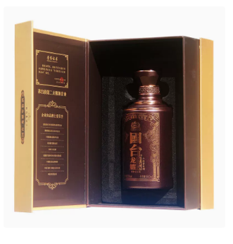 外包装以时尚的国际金为主色调,龙牌突出,中西合璧。瓶身以紫檀金为主色调,辅以玫瑰金的花纹,大气沉稳,彰显高贵。中国龙盘柱而起,昭示高端酱香带来的龙耀祥和,好运连连及财源广进。